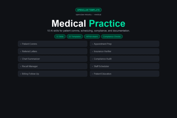 Complete review of the OpenClaw Medical Practice Manager — 10 AI skills for no-show prediction, insurance pre-auth, patient recall, and more. Built for physicians, dentists, and practice managers.