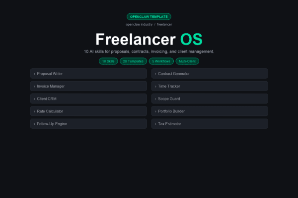 Complete review of the OpenClaw Freelancer Command Center — 10 AI skills for scope creep detection, proposal generation, invoicing, and more. Built for freelancers and independent consultants.