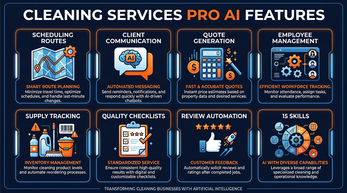 You started a cleaning company to build something. Instead, you spend 8-10 hours weekly on estimates, invoices, review responses, and marketing tasks that never seem to end. Your crews are great at cleaning — but nobody's great at the business side when it's 10 PM and you've been working since 6 AM.