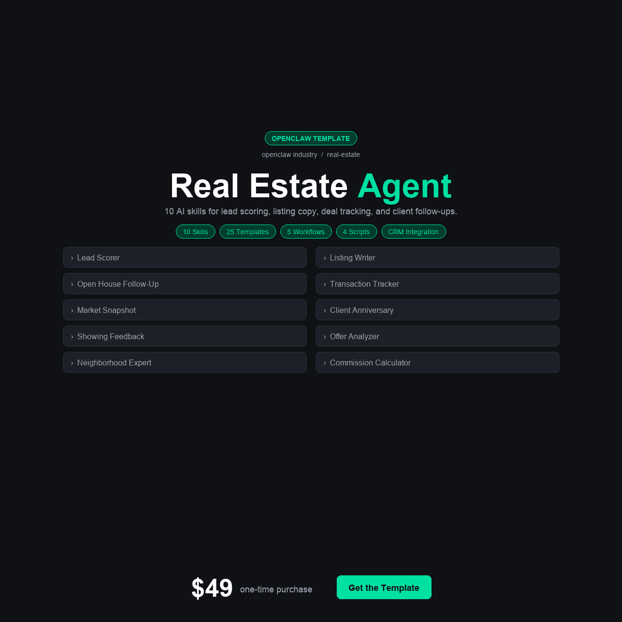 The OpenClaw Real Estate Agent is a complete AI-powered practice management template built specifically for real estate professionals. It includes 10 specialized skills, 4 configuration variants for different practice types, 5 integration guides for the tools agents already use, 5 automation workflows, 4 Python helper scripts, 20 ready-to-use message templates, and a 15-section walkthrough course — all for a one-time payment of $49 with no recurring fees.