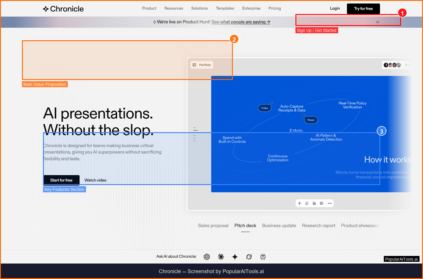 Chronicle is an AI-powered presentation maker designed for teams creating business-critical presentations. Unlike traditional slide tools, Chronicle uses a narrative-driven design engine that organizes content into storytelling frameworks — hook, problem, solution, proof sequences — that align with how audiences actually process information. With over 100,000 users on its waitlist before public launch and now used by 5,000+ teams, Chronicle includes Muse, a conversational AI assistant that lets you iterate on slides through natural language.