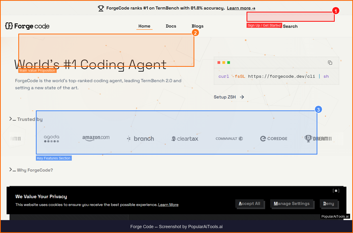 Run curl -fsSL https://forgecode.dev/cli | sh in your terminal. ForgeCode installs as a ZSH plugin in seconds.