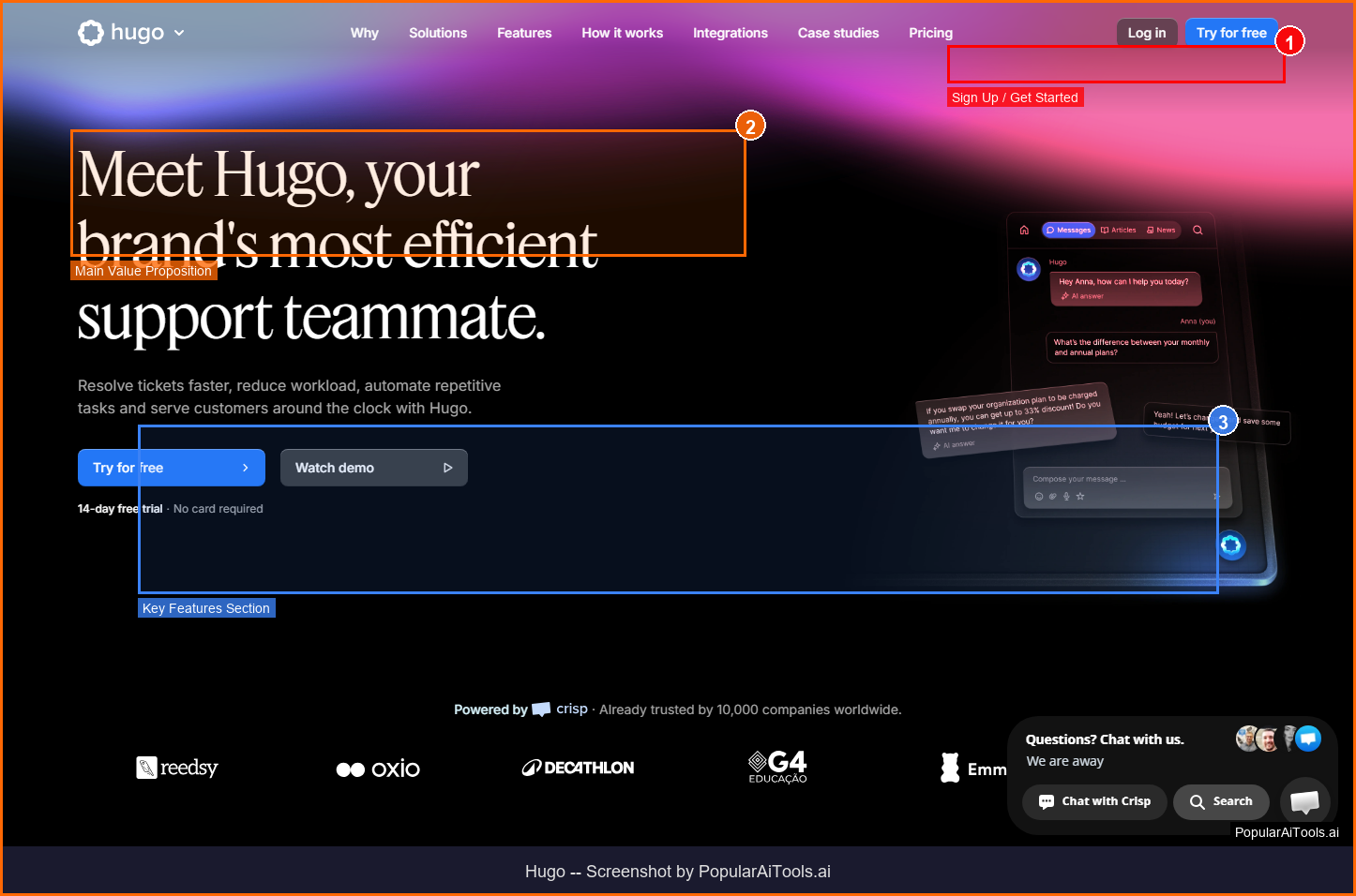 The main limitation is the Crisp ecosystem dependency — if you're deeply invested in Zendesk or Intercom, migration might not be worth the switching cost. But for teams starting fresh or looking to upgrade from basic chatbots, Hugo delivers exceptional value.