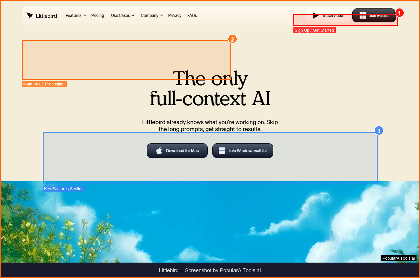 The Littlebird homepage - key features and navigation highlighted