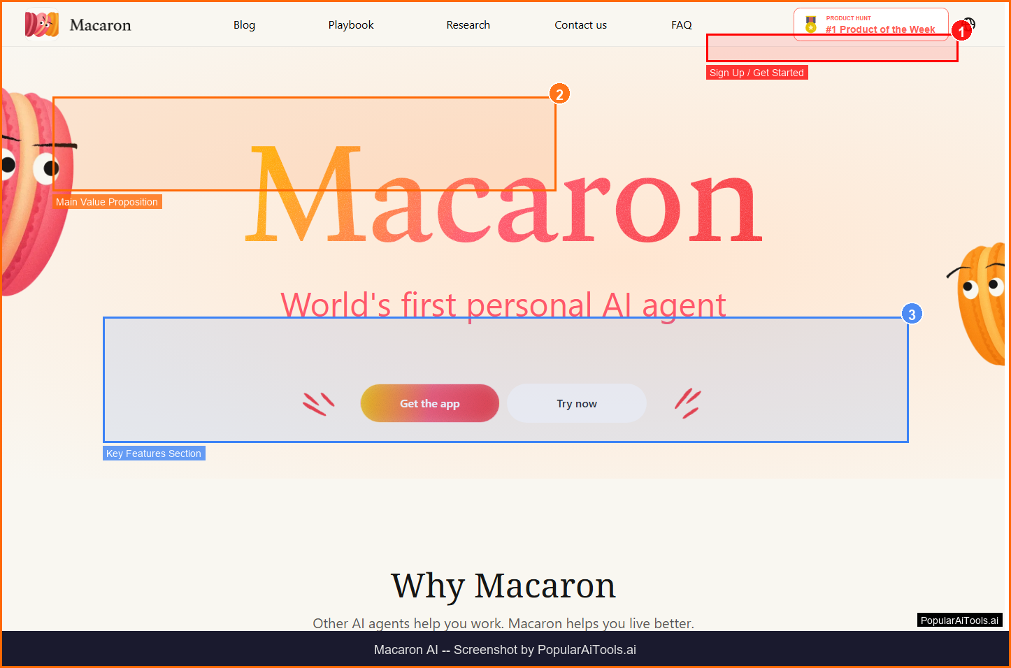 The Macaron AI homepage — key features and navigation highlighted