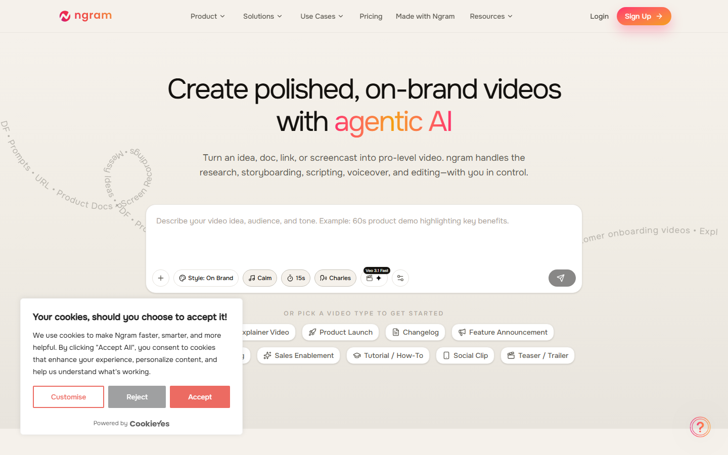 ngram is an AI-powered video creation platform that transforms plain-language descriptions into polished, branded videos. It integrates Remotion directly into its pipeline, letting users describe videos in natural language, choose animation styles like motion graphics, and have the AI generate the visuals and code behind the scenes. Designed for marketers, content creators, and teams who need professional videos fast without editing skills.