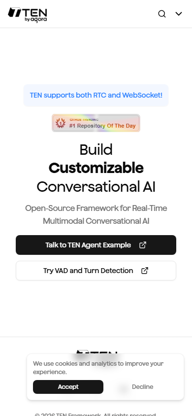 TEN is the world's first truly real-time multimodal agent framework for building next-generation conversational AI. Open-source and backed by Agora, TEN enables developers to create AI agents that can see, hear, and speak in real time with ultra-low latency. It supports voice, video, data streams, images, and text, integrating with models from OpenAI, Google, DeepSeek, and more — all through a plug-and-play extension system and visual Graph Designer.