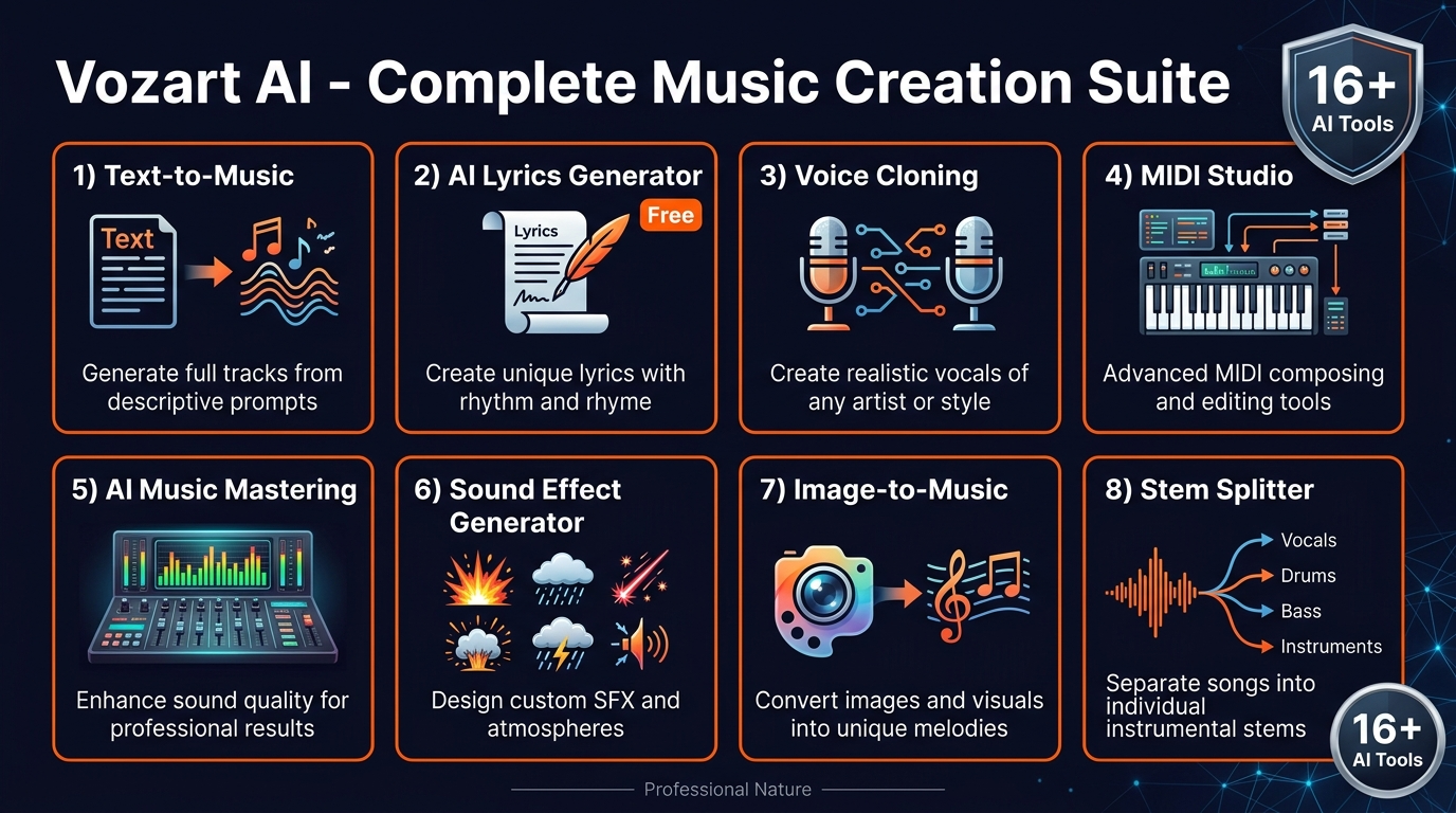 Vozart AI is an AI-powered music creation platform that converts text prompts, lyrics, and even images into original, royalty-free music tracks. What makes Vozart stand out in the crowded AI music generator space (74,000 monthly searches) is the sheer breadth of its toolset: over 16 distinct AI tools ranging from a MIDI Studio and AI mastering engine to a sound effect generator and image-to-music converter.