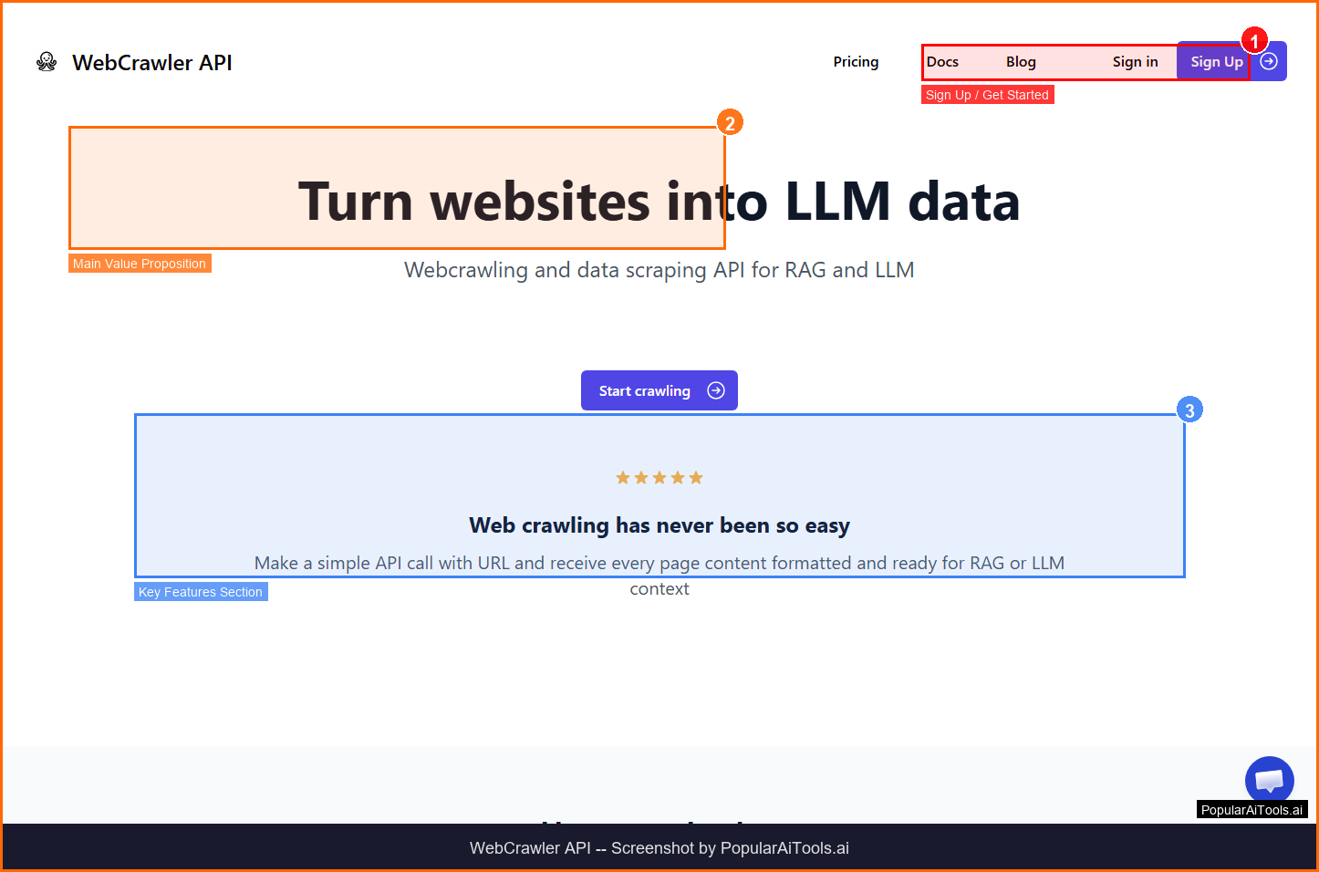 WebCrawler API homepage -- Screenshot by PopularAiTools.ai